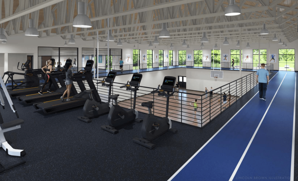 - A full-size indoor gym, a work-out area with athletic equipment, an enclosed space for fitness classes, and an indoor walking trail for running or walking, for patients and the public